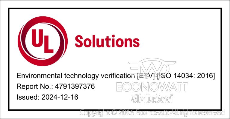 ผลิตภัณฑ์โอโซนบำบัดน้ำในระบบคอนเดนเซอร์ของ ECONOWATT ได้รับการรับรองมาตรฐาน UL Solutions: Environmental Technology Verification (ETV) ซึ่งเป็นมาตรฐานระดับสากลที่ยืนยันถึงประสิทธิภาพ ความปลอดภัย และความเป็นมิตรต่อสิ่งแวดล้อม โดยเทคโนโลยีของเราถูกพัฒนาให้เป็น Non-residual chemical ที่ช่วยลดผลกระทบต่อสิ่งแวดล้อมได้อย่างมีประสิทธิภาพ